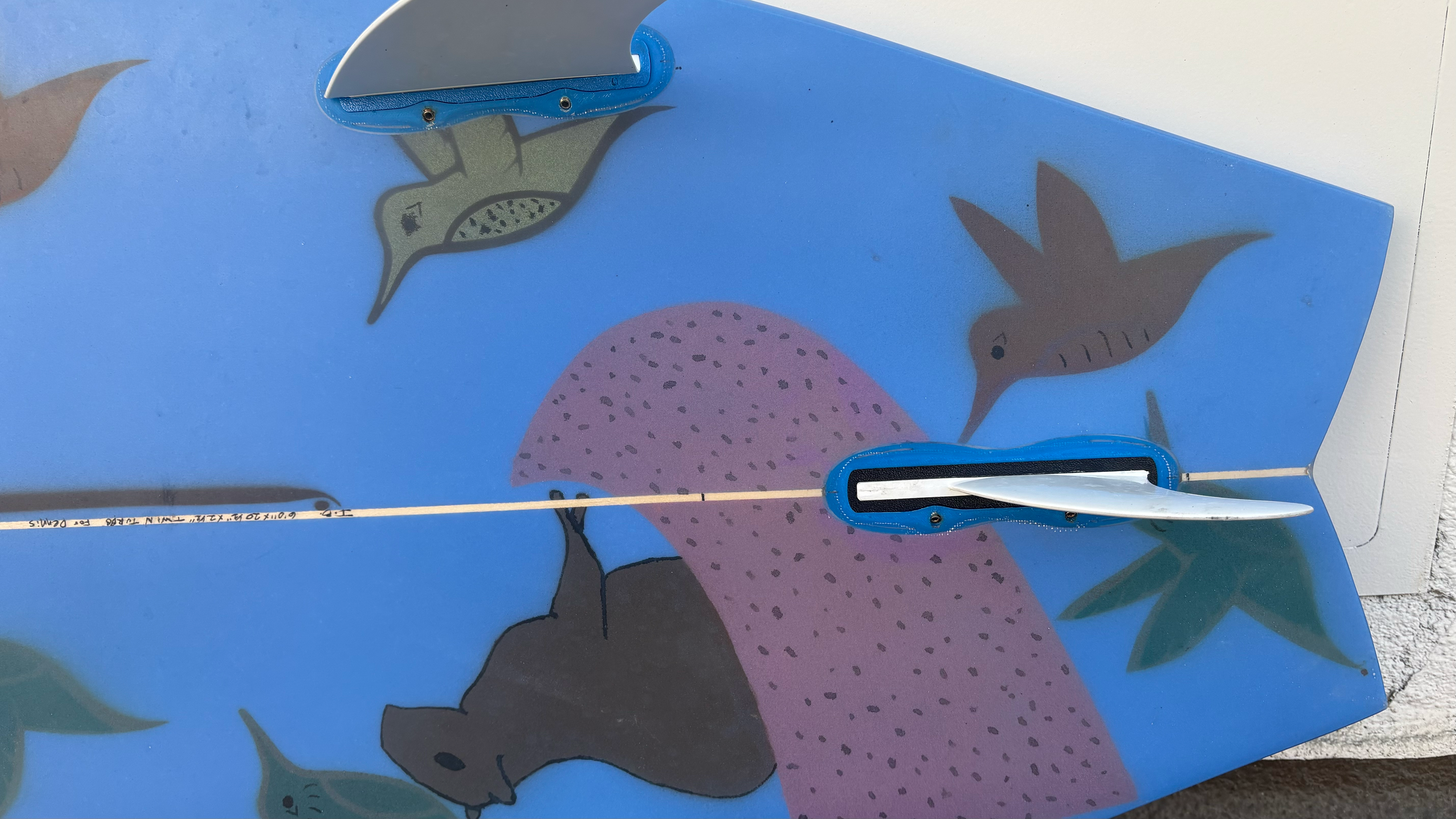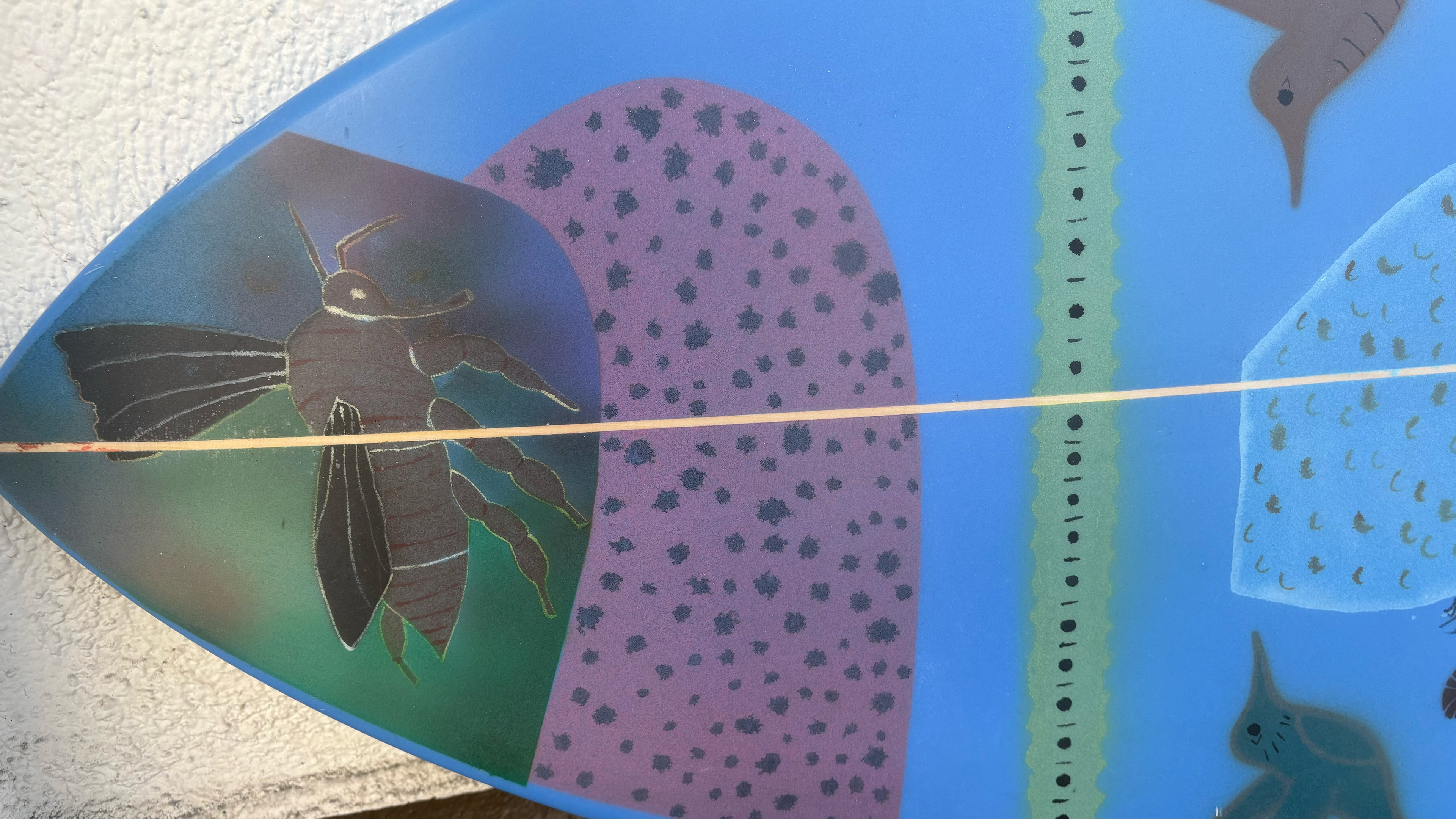 Once a upon a time in a place called the South Bay, a husband asked his diminutive wife if she would do the honor of painting a surfboard he had just commissioned from the best surfboard shaper in the whole shire. The wife reflected upon such a request and lovingly agreed to airbrush a collection of nature-inspired motifs that held great significance to the husband. Behold the work of that pint-sized wife.
